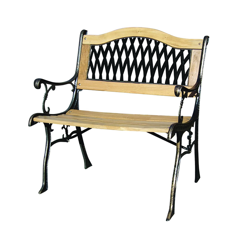 Садовая скамейка из чугуна античного цвета, дерева натурального цвета с пластиковой решеткой. Его размеры: 60 х 55 х 75 см.