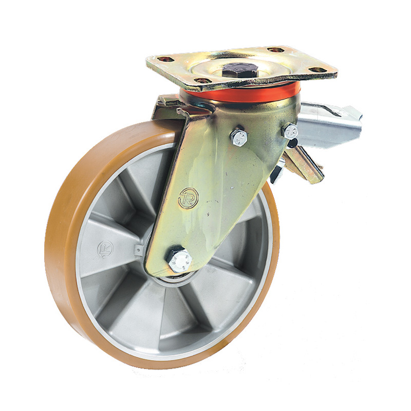 Поворотный ролик с полиуретановым тормозом с алюминиевым ободком на подшипнике TELLURE ROTA Ф150мм производства Италии, центральная часть из полипропилена. Подходит для тележек и машин средней грузоподъемности. Подходит для внутреннего и наружного использования с частой мойкой и стерилизацией. Этот тип колес подходит для всех типов полов, даже на открытом воздухе. Применяются в тележках промышленного назначения, трубчатых тележках, тележках для пищевой и химической промышленности, а также в мобильных строительных лесах.