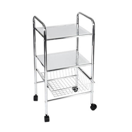 Полка для ванной с двумя полками и корзиной. Он оснащен колесами, что позволяет легко перемещать его. Размеры полки 40 х 73,5 х 32 см.Изготовлен из хромированного металла.