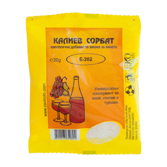Сорбат калия в упаковке 20 г – универсальный консервант. Используется для стабилизации вина, соков, солений, рассола, квашеной капусты и многого другого. При использовании для сладких вин, маринадов и виноградных соков на 1 л основного продукта добавляют 1-2 г щербета.