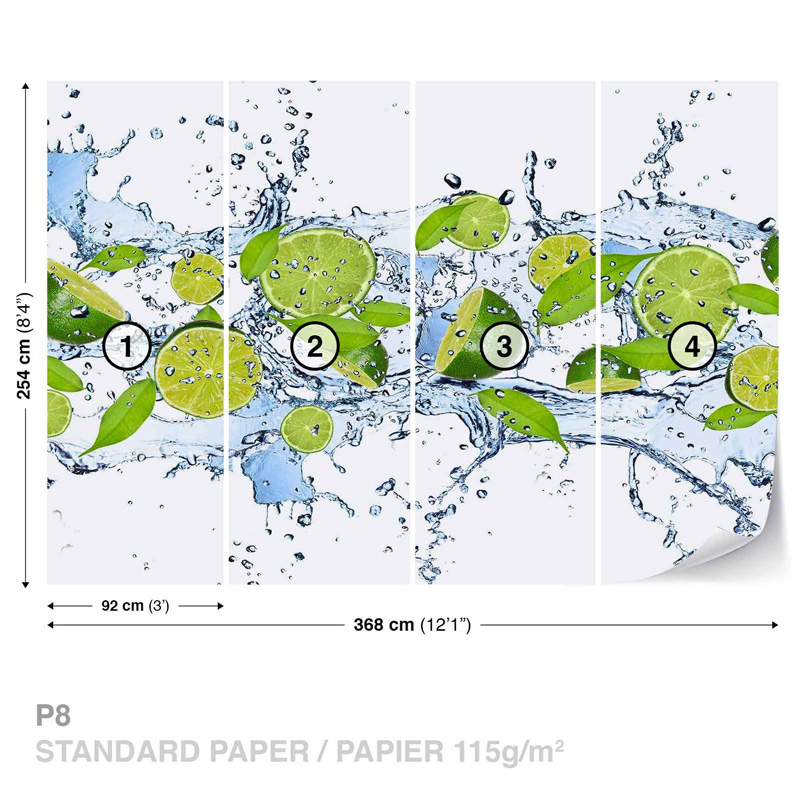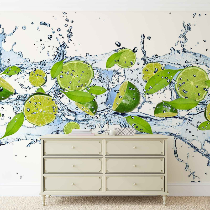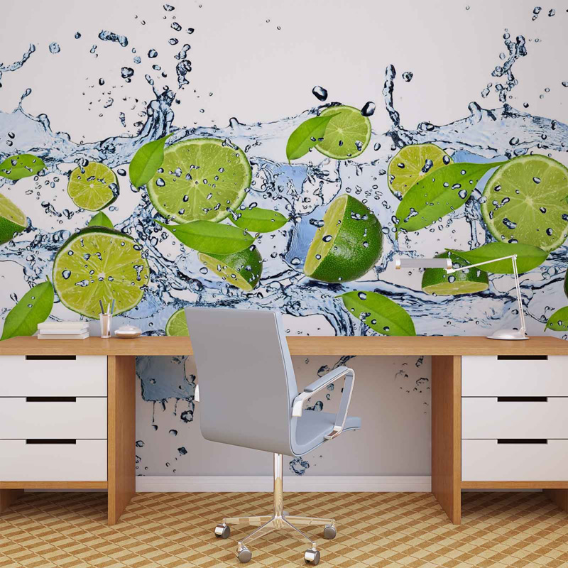 Качественные широкоформатные обои с изображением зеленых лимонов в воде. Фотообои подходят для оформления стены в любом помещении, не подверженном воздействию повышенного уровня влажности.