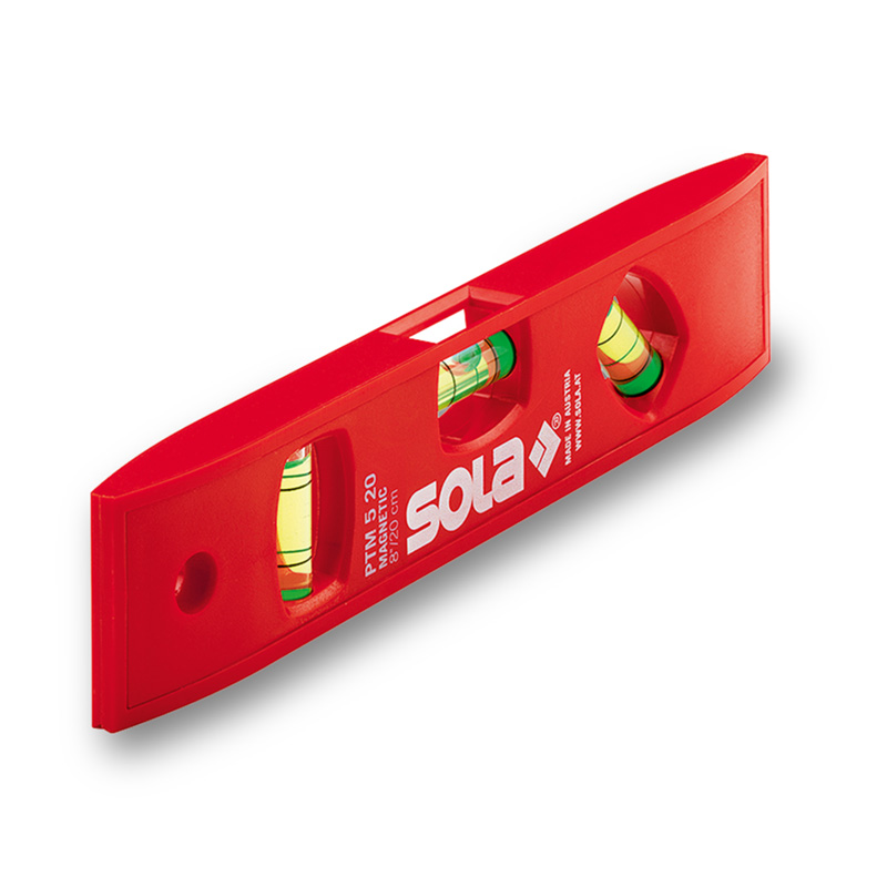 Пластиковый уровень SOLA PTM5/20 для строительной резьбы, изготовлен из высококачественного АБС-пластика. Измеритель оснащен одним горизонтальным и одним вертикальным уровнем (стеклянным), изготовленным из акрила. Имеет магнитное основание, обеспечивающее большее удобство и точность при работе. Для удобства пользователей счетчик также снабжен ватерпасом, расположенным под углом 45°. Уровень характеризуется высокой точностью измерений, как по горизонтали, так и по вертикали. Счетчик STMA PTM5/20 состоит из алюминиевого трубчатого профиля, отличающегося эпоксидным покрытием и резиновыми амортизирующими наконечниками. Длина уровня 20 см, а профиля 37 х 15 мм.Максимально допустимое отклонение, производимое уровнем, находится в пределах 1,5 мм/м. Счетчик STMA PTM5/20 чрезвычайно устойчив к внешним изменениям и воздействиям, таким как намокание, жара и холод.Его преимуществом является возможность производить замеры под углом, в зависимости от характера работы.Область применения измерительного прибора широка, но наиболее необходимой модель РТМ5/20 фирмы SOLA оказывается при укладке фаянсовой плитки в ванных комнатах, туалетах и т. д.