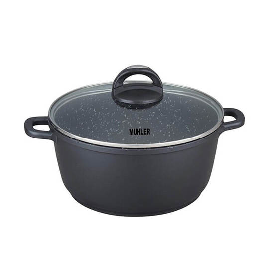 Кастрюля с крышкой MR-205M марки MUHLER черного цвета. Кастрюля изготовлена из литого алюминия с мраморным антипригарным покрытием. Его размер Ф20 см, объем 1,7 л.