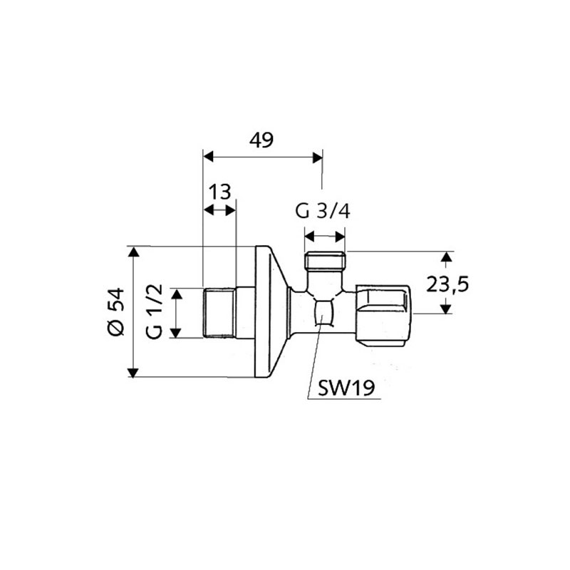 Угловой запорный вентиль SCHELL Comfort для удобного и профессионального подсоединения шлангов стиральных и посудомоечных машин. Крепится к стене, размер присоединения 1/2". Оснащен раструбом, придающим компактность запорной арматуре. Закрывает любое нежелательное расстояние при установке запорной арматуры на стену. Обеспечивает гибкость подключение шлангов на другом конце, размер соединительного отверстия 3/8". Запорный кран изготовлен из твердой латуни с хромовым покрытием. Он устойчив к влаге, износу и перепадам температур. Диаметр патрубка Ф54 мм. Расстояние между двумя монтажными отверстиями составляет 49 мм.