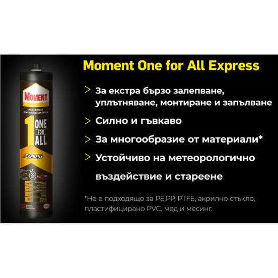 Moment FIX Express — это первый профессиональный растворяющий клей Moment, который мгновенно склеивает несколько материалов. Благодаря своей инновационной формуле он моментально схватывается без необходимости испарения растворителя, дополнительного укрепления или ожидания.
