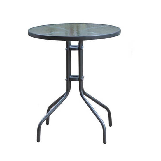 Круглый садовый стол из металла и стекла диаметром 60 см и высотой 70 см. Стол серый. Несмотря на то, что он имеет металлическую конструкцию, он подходит для уличных условий. Он устойчив к ржавчине и коррозии, что является обязательным условием для использования на открытом воздухе. Круглый садовый стол также является элегантным и стильным решением для меблировки террасы благодаря своим компактным размерам.