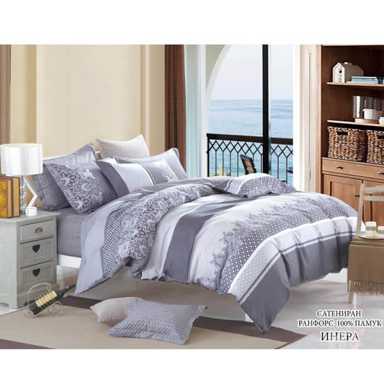Спальный гарнитур Inera с двуспальной кроватью, состоящий из 5 частей. Изготовлен из высококачественной ткани Ранфорс - 100% хлопок. Постельное белье состоит из простыни, 2-х конвертов и 2-х наволочек. Детали имеют печатный рисунок.
