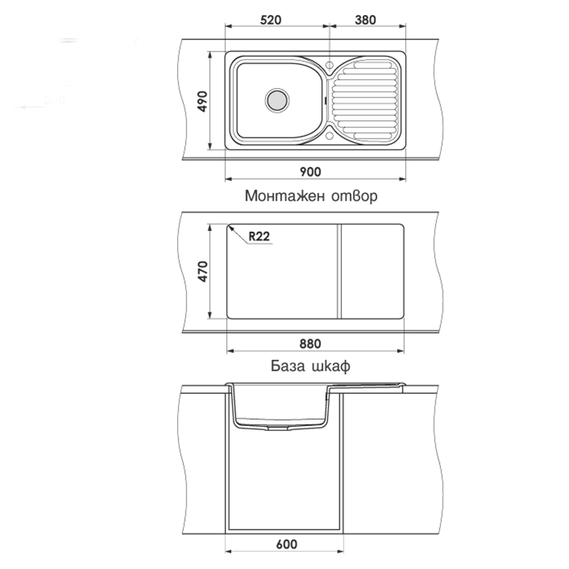 Встраиваемая кухонная мойка FAT из гранита, размер 90 x 49 см, с возможностью выбора столешницы слева или справа. В комплект входит высококачественный итальянский сифон для мойки размером Ф90 мм.