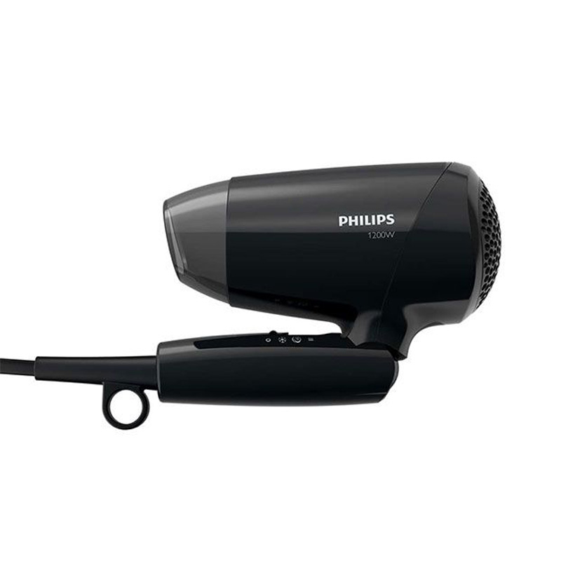 Фен BHC010/10 марки PHILIPS. Устройство имеет мощность 1200Вт и имеет 3 этапа работы. Он питается от сети 220В. Очень компактный и удобный для переноски, чему способствует складная ручка. Именно поэтому этот фен заряжен еще и как туристический фен, ведь его можно везде носить с собой.