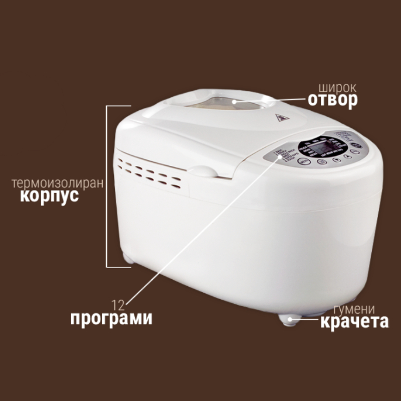 Хлебопечка ZEPHYR модель Z 1446 A может выпекать практически все виды хлеба, в том числе цельнозерновой, кукурузный. Кроме того, вы можете замесить тесто для хлеба, лепешек, коржей и т.д. Пекарня достаточно умная и инновационная - можно выбрать из 12 программ для приготовления разных видов хлеба на разный вкус. Помимо традиционных видов хлеба, в машине есть программа для полезного безглютенового хлеба. Панель управления цифровая и на крышке есть широкое окошко для наблюдения за процессом. Пекарня предлагается в комплекте с: