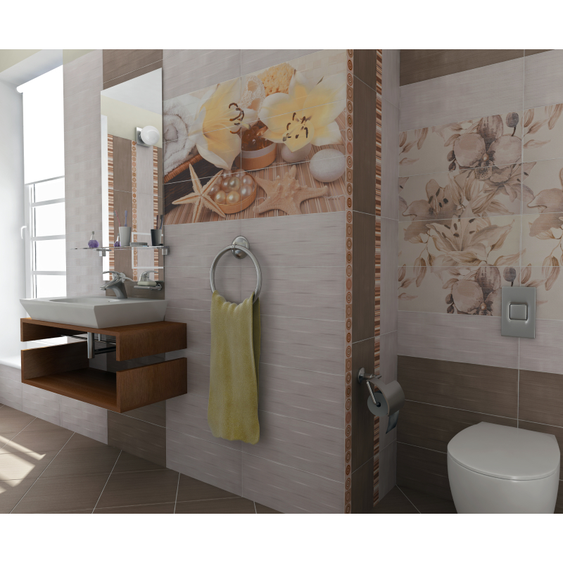 Декор плитки Relax из серии Viola бренда KAI преимущественно коричневого цвета. Доступен в наборе из 6 плиток размером 20 х 50 см. Таким образом, общий размер плиточного декора становится 60 х 100 см.