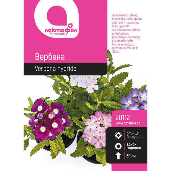 Вербена – однолетнее растение. Цветет пурпурным, белым, розовым, персиковым или красным цветом. Очень популярен для выращивания в подвесных горшках, в альпинариях или в ящиках на подоконнике. Семена высевают ранней весной. Растения должны кондиционироваться в течение нескольких часов снаружи, прежде чем навсегда выноситься в сад или на балкон. При прикреплении прищипните средний стебель каждого растения, чтобы оно начало расти как куст.