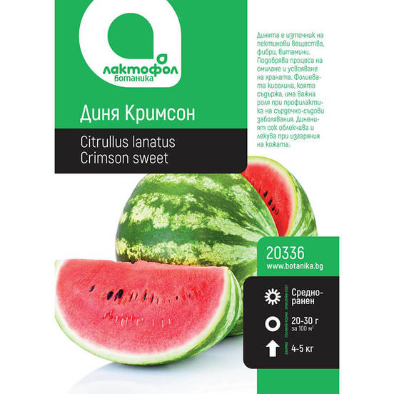 Малиновый арбуз – источник пектина, клетчатки, витаминов. Улучшает процесс пищеварения и усвоения пищи. Содержащаяся в нем фолиевая кислота играет важную роль в профилактике сердечно-сосудистых заболеваний. Арбузный сок снимает и заживляет ожоги кожи. Сорт Кримсон – однолетнее растение семейства Тыквенные. Главный корень арбуза достигает глубины более одного метра. Они требовательны к теплу и свету. Им необходимы подкормки азотом, фосфором и калием в легкоусвояемой форме. Их выращивание успешно в регионах с жарким климатом и длительным вегетационным периодом. В некоторой степени они переносят засуху, что определяет более высокую сахаристость и аромат плодов.