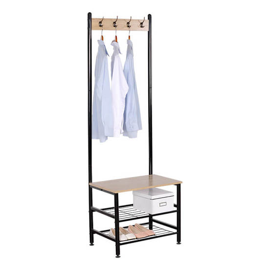 Стильная подставка/вешалка для одежды в минималистичном дизайне. В нем есть четыре вешалки, две полки для хранения органайзеров и коробок, а также зона отдыха. Изготовлен из комбинации ДСП дуба Sonoma и черной стали.
