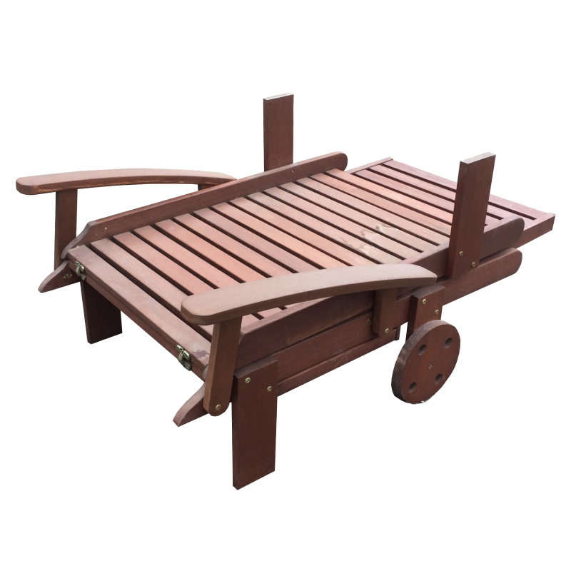 Деревянный складной шезлонг с подлокотниками, регулируемой спинкой, колесами и встроенным столиком.