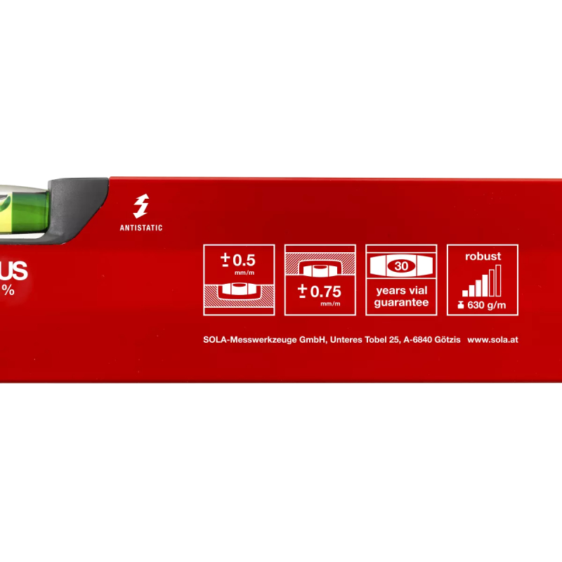 Алюминиевый уровень SOLA BigX 60 отличается лучшей, быстрой и точной работой. Модель противоударная с акриловыми ватерпасами с увеличительными линзами (+60%) и 30-летней гарантией от протечек. Уровни отличаются лучшей видимостью при слабом освещении за счет люминесцентного слоя. Профиль уровня алюминиевый, Х-образный, с амортизирующими колпачками на обоих концах.