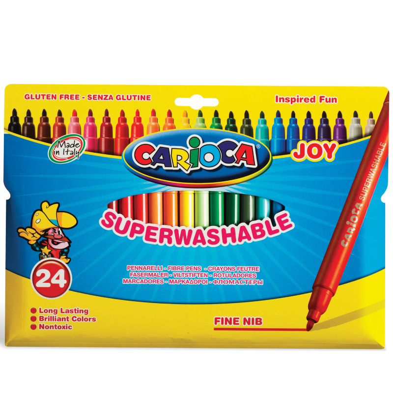 Цветные маркеры CARIOCA Joy отличаются очень яркими цветами и отличной укрывистостью. Они отлично моются и идеально подходят для рисования и раскрашивания. Наконечники устойчивы и имеют диаметр 2 мм. Они оснащены системой блокировки стоп. Коробка картонная, типа блистер. В наборе 24 цветных маркера для раскрашивания вентиляционными колпачками.