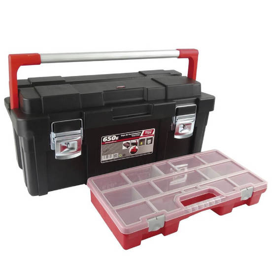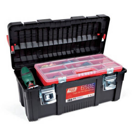 Чемодан для инструментов TAYG 650-E относится к серии Professional. Чемодан, изготовленный из высококачественного полипропилена PP, отличается высокой устойчивостью к суровым условиям эксплуатации. Имеет алюминиевую ручку и две металлические застежки. Длинная алюминиевая ручка обеспечивает удобство захвата и транспортировки, что обеспечивает безопасность. Ручка закрывает крышку чемодана. Внутри находится органайзер с крышкой. Габариты модели составляют 650 х 300 х 295 мм, а ее грузоподъемность составляет внушительные 120 кг.