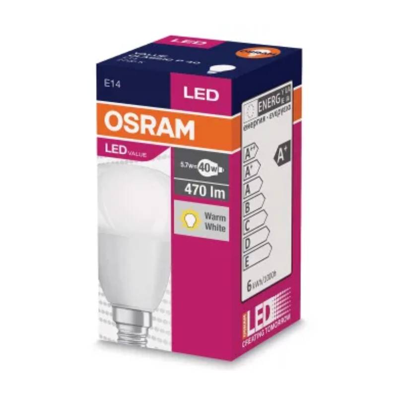 Энергосберегающая светодиодная лампа OSRAM в форме шара. Светодиодная лампа имеет мощность 5,7Вт (эквивалент лампы накаливания 40Вт), цоколь Е14 и световой поток 470лм.