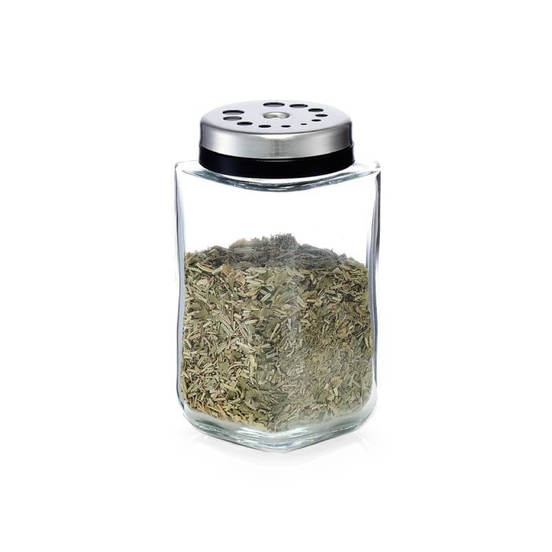 Баночка для специй с металлической крышкой с винтом и отверстиями разного размера для точной дозировки. Баночка изготовлена из стекла.
