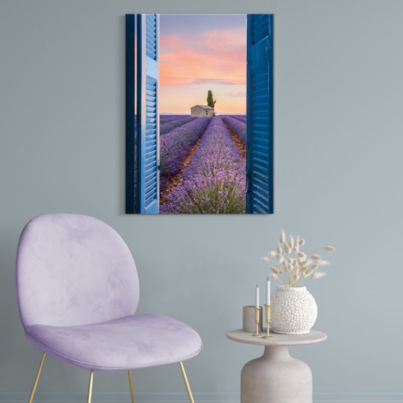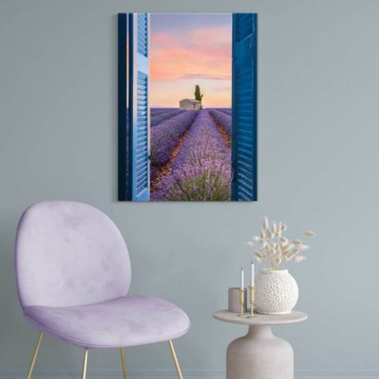 Настенная картина с изображением Лавандовое поле бренда STYLER. Картинка имеет высокое разрешение печатного изображения. Холст натянут на деревянный подрамник из натурального дерева и имеет размеры 60 х 80 см.