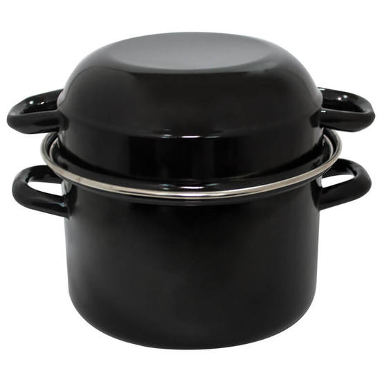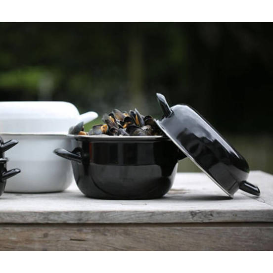 Горшок для мидий Moules имеет диаметр 24 см. Емкость большого контейнера составляет 6,5 литров, а маленького - 3 литра.Поднос изготовлен из высококачественного эмалированного металла.