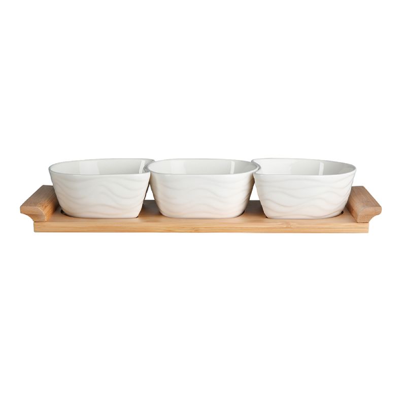 Стильный набор керамических мисок для подачи закусок, соусов, чипсов, орехов и многого другого. Чаши предлагаются в комплекте с бамбуковой подставкой.