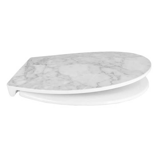 Сиденье для унитаза украшено стильным принтом из белого мрамора, что делает его акцентом в ванной комнате.