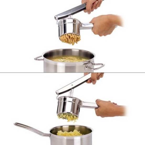 Прибор TESCOMA GrandChef предназначен для приготовления пюре из отварного картофеля. Отлично подходит для приготовления пюре - супов и макаронного супа. Положите очищенный отварной картофель и нажмите на ручку. Чтобы сделать пасту, используйте диск с большими отверстиями. Пресс изготовлен из высококачественной нержавеющей стали. Можно мыть в посудомоечной машине.