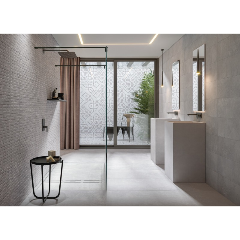 Настенная плитка для ванной комнаты – фаянс белого цвета со структурой, имитирующей бетон. Плитка Cifre Ceramica производится в Испании. Плитка для ванной имеет размер 25 х 60 см и толщину около 9 мм. В одной коробке находится 7 черепиц общей площадью кровли 1,05 кв.м.