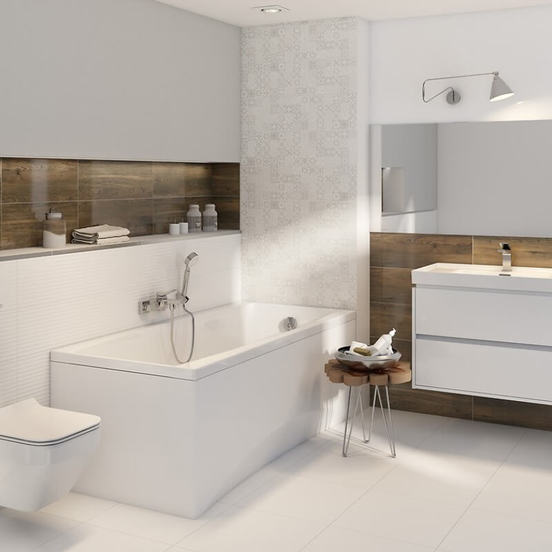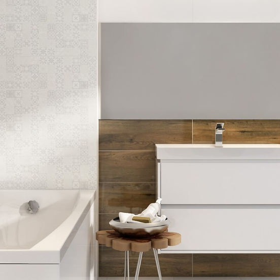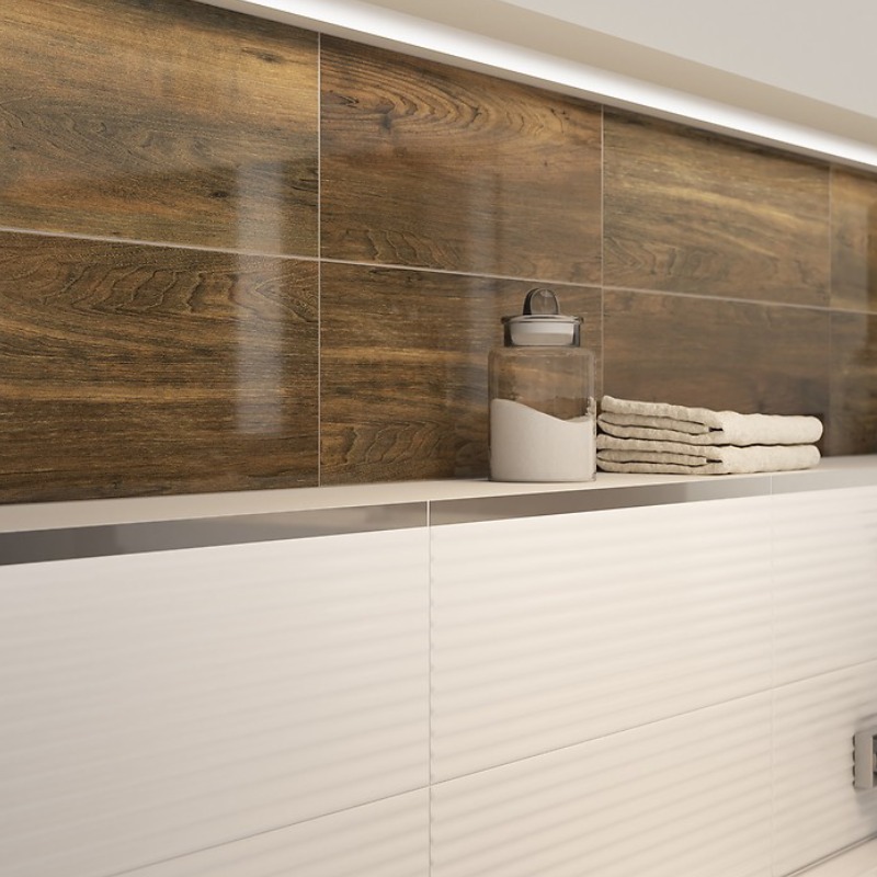 Плитка для стен в ванной комнате - коричневый фаянс, с гладкой и глянцевой поверхностью, имитирующей дерево. Плитка высшего качества, произведена в Польше, ее размер 20 х 60 см. В одной упаковке 9 плиток общей площадью покрытия 1,08 кв.м.