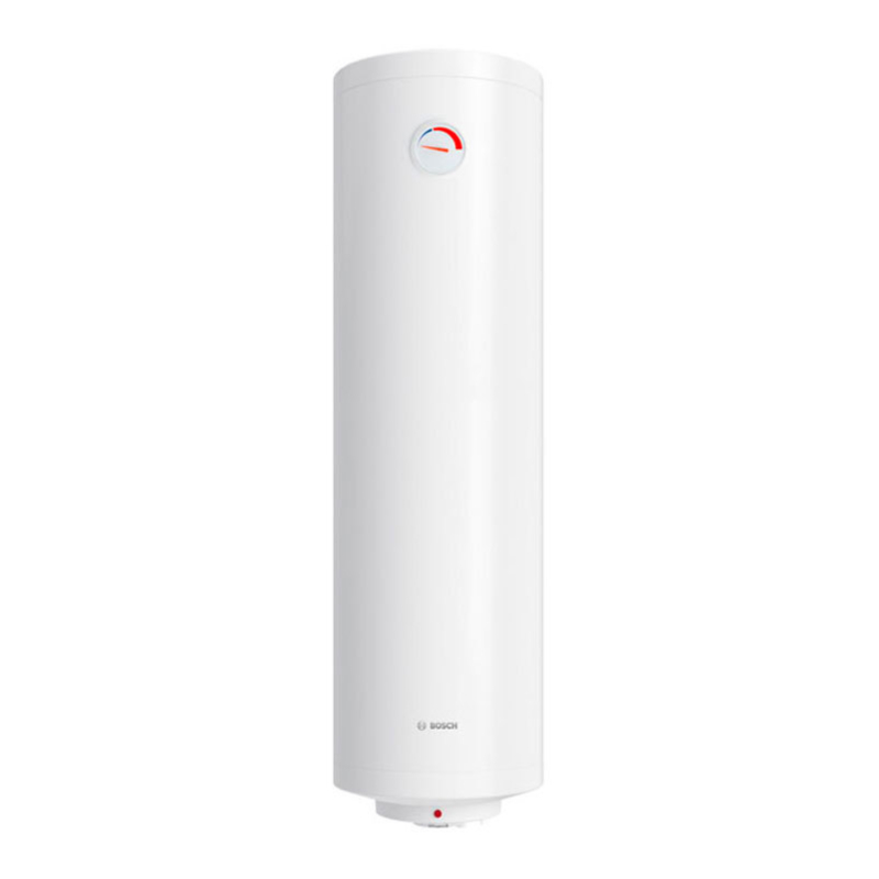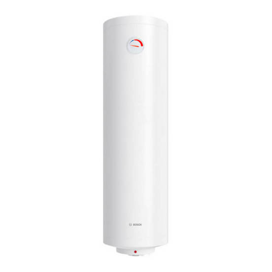 Вертикальный котел модели Tronic TR1000T 80 SB марки BOSCH. Котел имеет объем 80 л и мощность 2 кВт. Высота 120 см и диаметр 39 см.