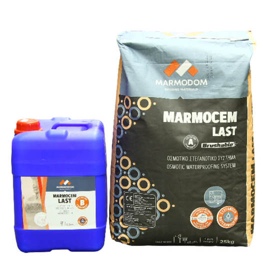 MARMOCEM LAST – двухкомпонентная эластичная цементная гидроизоляционная мембрана, 31,5 кг – высокоэффективная гидроизоляционная система, предназначенная для длительной защиты зданий и сооружений от проникновения влаги и воды. Представляет собой пастообразную, эластичную и осмотическую двухкомпонентную смесь, которая при нанесении вступает в реакцию с цементными компонентами основания с образованием устойчивых, нерастворимых солей. Они проникают в капилляры и поры бетона, создавая осмотический барьер, который полностью герметизирует конструкцию и обеспечивает водонепроницаемость.