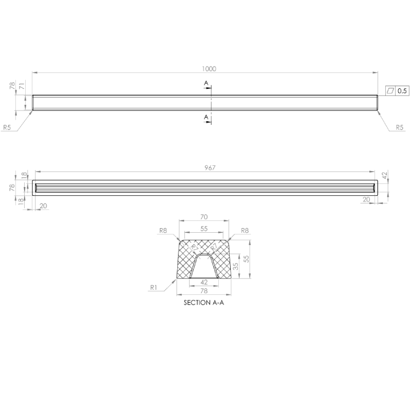 Душевой порог марки FAT. Порог прямой, с закругленным краем, высота 100 см. Высота: 5,5 см.Ширина: 7,8 см.