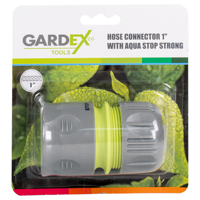 Быстроразъемный соединитель для шланга 1" со стопором марки GARDEX. Соединители типа быстроразъемные двухкомпонентные, изготовлены из мягкого TPR-покрытия и высококачественного АБС-полимера, устойчивого к низким температурам. Соединение имеет функцию блокировки от случайного отсоединения и пробка для воды.