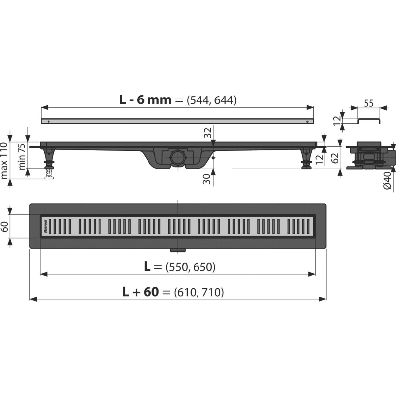 Сифон для ванной комнаты линейный 650 мм с латунной решеткой Simple APZ10BLACK-650BRASS.