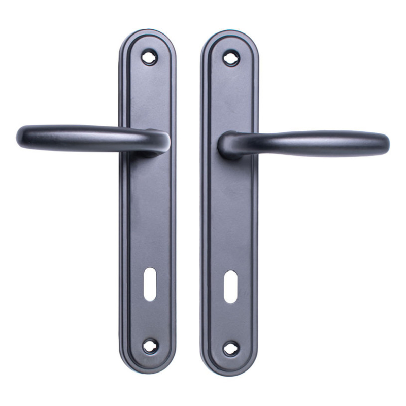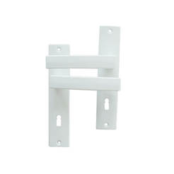 Простая дверная ручка из серии Deka бренда YALE. Расстояние между центрами: 90 мм. Щитки изготовлены из стали, а рукоятки – из цинко-алюминиевого сплава. Ручки подходят для межкомнатных дверей.