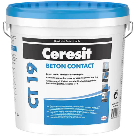 Контактная грунтовка для бетона ST 19 – 5 кг CERESIT. CERESIT CT 19 — быстросхватывающаяся грунтовка для надежного склеивания керамических покрытий, натурального камня, цементных оснований полов и стен, а также ответственных поверхностей. Для внутреннего и наружного применения. СТ 19 применяется для подготовки основания перед нанесением клея для укладки керамической плитки, настенных и напольных покрытий и перед нанесением штукатурки. CT 19 – идеальное решение для всех впитывающих и невпитывающих оснований.