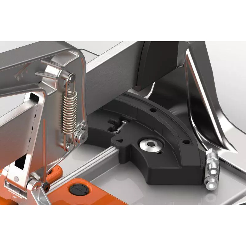 - Удобный и точный угловой упор: позволяет выполнять диагональные резы с регулировкой от -45° до +45° и оснащен моноблочной измерительной шкалой для прямого и точного считывания.