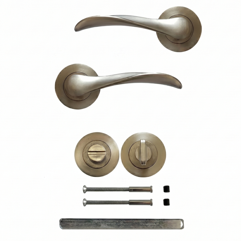 В комплект входят две ручки: простая ручка и накладка, оснащенные встроенным запирающим механизмом. Предназначены для установки на двери в ванных комнатах и туалетах, где требуется легкое и надежное запирание изнутри.