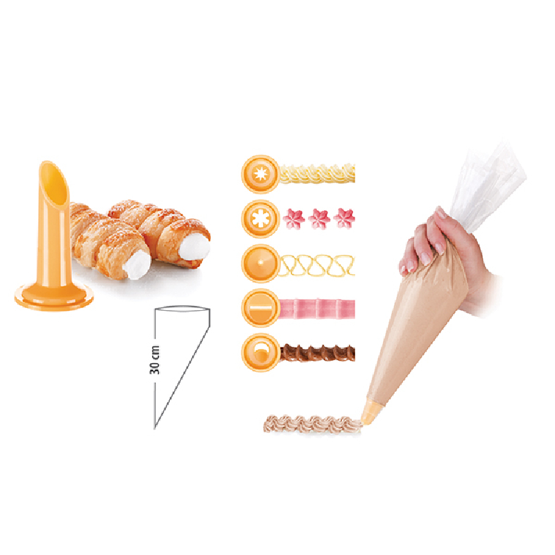 - В набор входит: 1 кондитерский мешок, 6 различных декоративных насадок, 10 кондитерских мешков