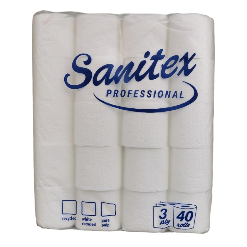 Туалетная бумага Sanitex Professional изготовлена из 100% чистой целлюлозы и имеет трехслойную структуру для максимального комфорта и прочности во время использования. Большая упаковка из 40 рулонов идеально подходит для профессионального и интенсивного использования в офисах, отелях, ресторанах и других общественных местах.