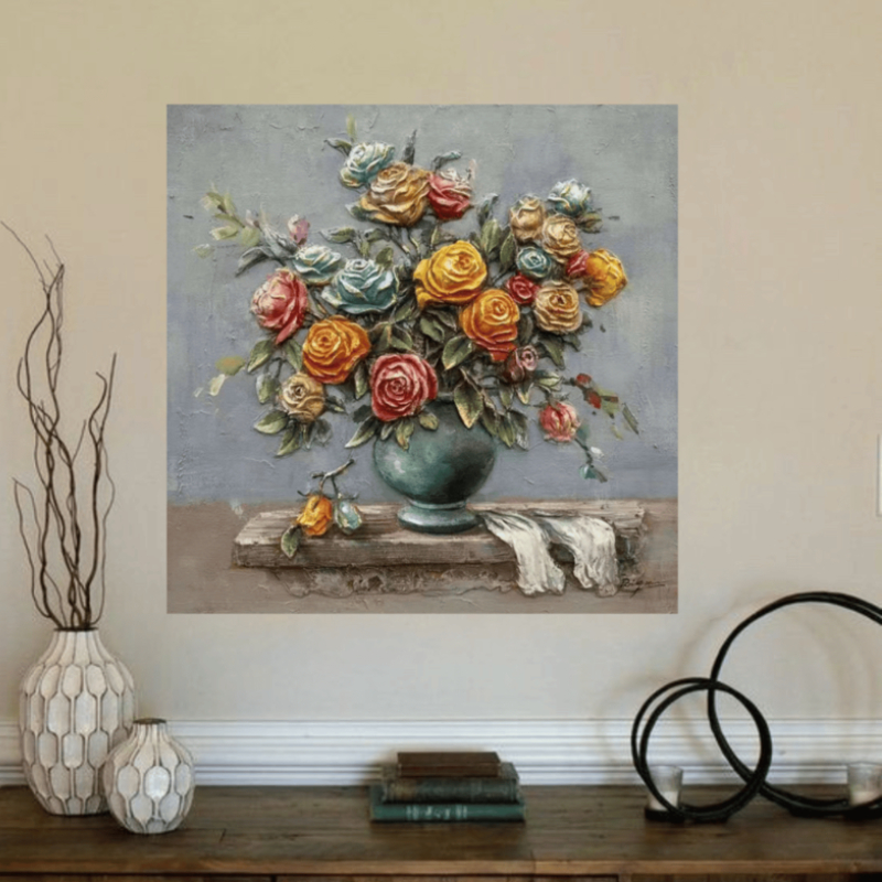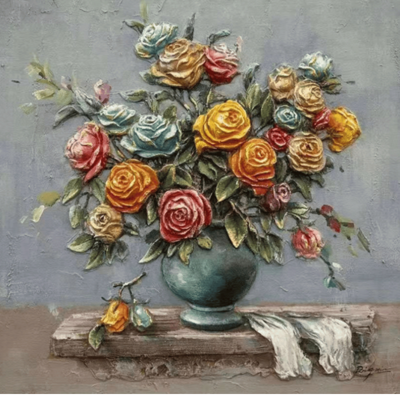 Картина «Рельефные розы» представляет собой изысканную композицию красочного букета роз, поставленного в элегантную вазу. Цветы изображены с богатым рельефом, что придает работе глубину и выразительность. Теплые и нежные цвета — желтый, оранжевый, красный, синий и зеленый — гармонично сочетаются и создают ощущение уюта, роскоши и художественного стиля.