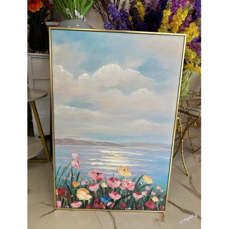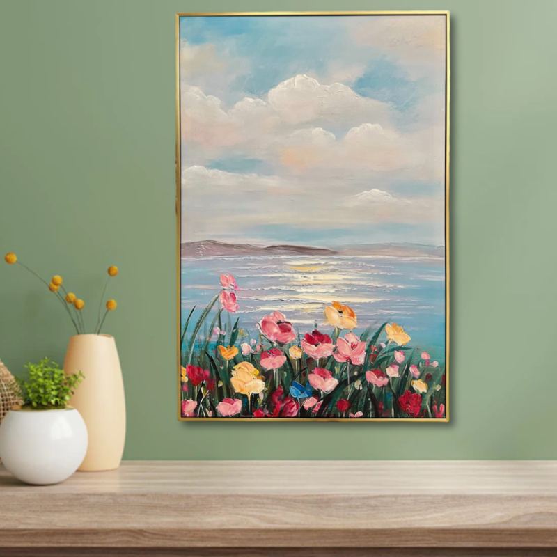 Картина «Цветы у моря» воссоздает спокойствие и красоту природного пейзажа благодаря мягкой и сбалансированной цветовой композиции. Синие тона создают ощущение простора и свежести, желтые акценты добавляют света и тепла, а розовые оттенки придают мягкость и романтическое сияние.