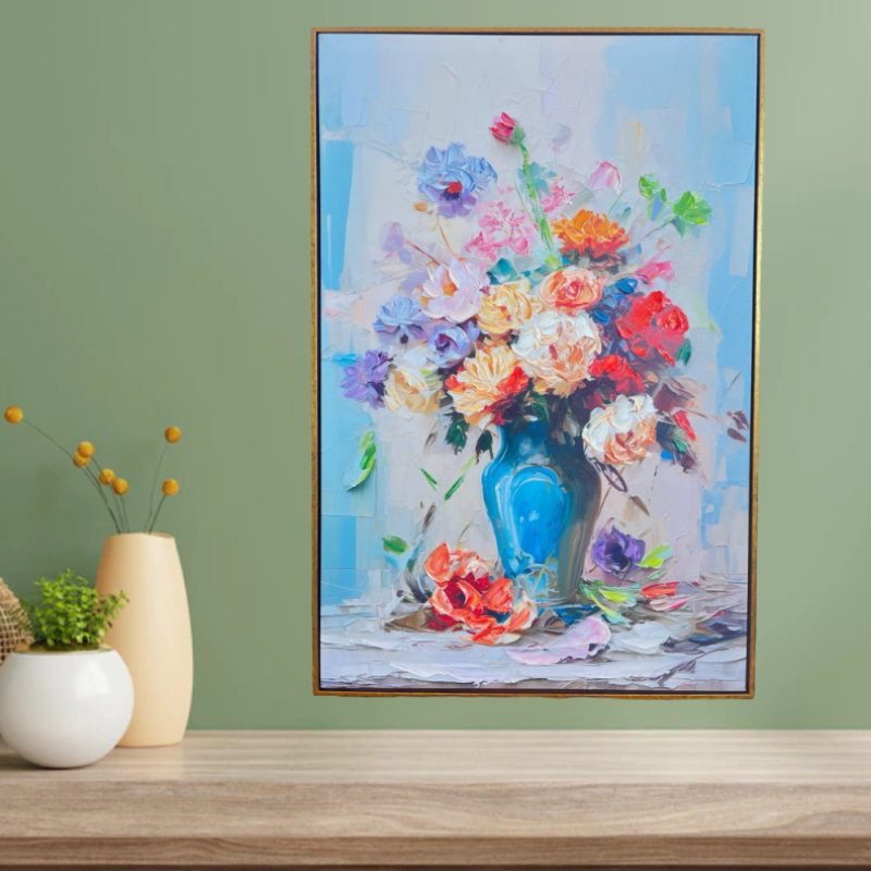 «Синяя ваза с цветами» — впечатляющая цветочная картина, полная динамики, энергии и жизненной силы. Богатая палитра синих, фиолетовых, красных и желтых оттенков создает настоящий праздник для чувств, напоминающий цветущий сад посреди весны. Цвета гармонично переплетаются, придавая композиции глубину и художественное сияние.