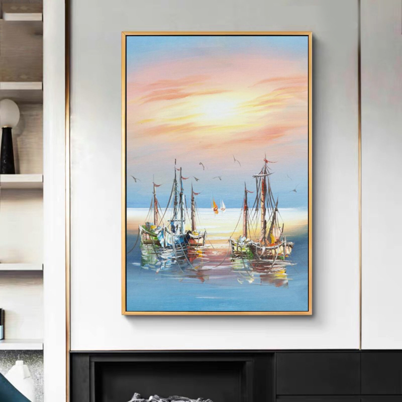 «Парусники в море» — вдохновляющий морской пейзаж, передающий ощущение свободы, движения и безграничных мечтаний. Небольшой корабль плывет по спокойным водам, окутанный насыщенными синими тонами, дополненными теплыми красными, оранжевыми и розовыми оттенками неба. Цветовая гармония создает романтическую и слегка мистическую атмосферу, напоминающую о далеких горизонтах и новых началах.