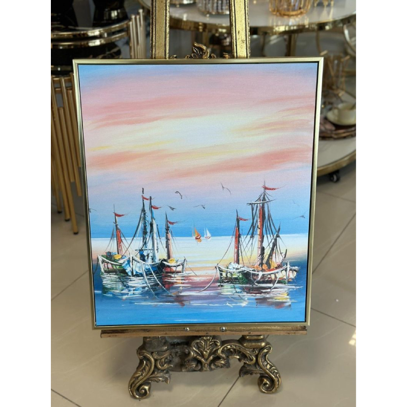 Картина выполнена на холсте и обрамлена золотой рамой, что подчеркивает ее элегантность и придает изысканность. Она подойдет для гостиной, спальни, офиса или гостиничного номера, где создаст ощущение простора и вдохновения.