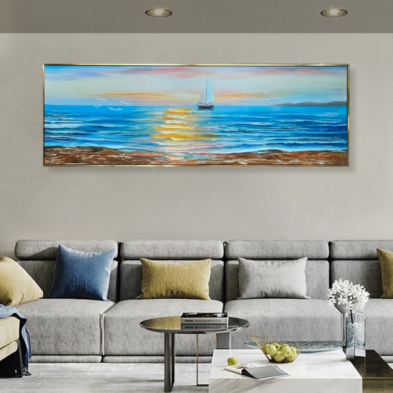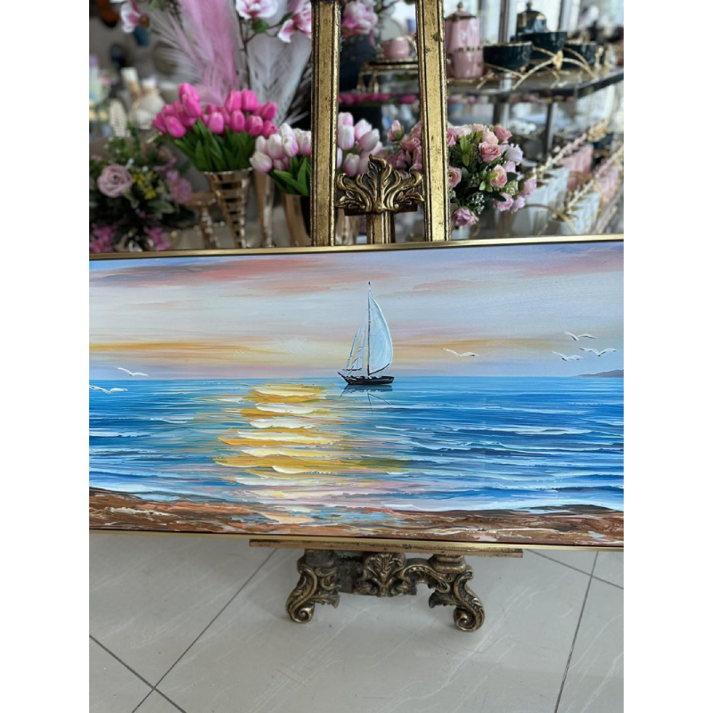 «Лодка в море на рассвете» — впечатляющая панорамная картина, запечатлевшая спокойствие и бесконечность морского горизонта. Композиция создает ощущение движения и свободы, словно взгляд следует за путем, ведущим к морю и далеким огням на горизонте. Мягкие цветовые переходы и тонкие рельефные детали придают изображению глубину и реализм.