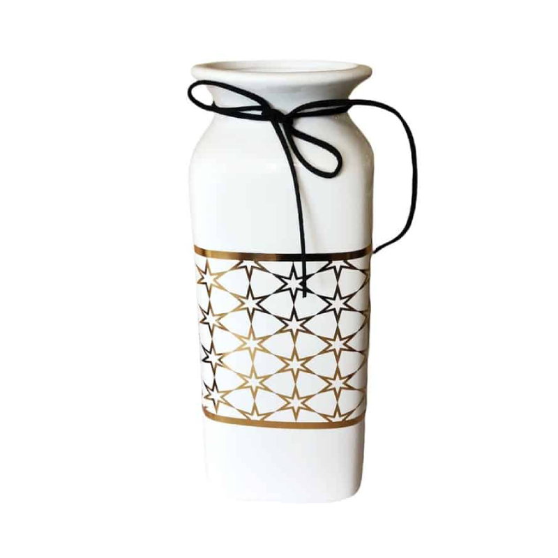 Белая ваза с элегантными золотыми акцентами — это невероятно стильный декоративный элемент, который привнесет изысканность и свет в любой интерьер. Ее изящный дизайн делает ее универсальным акцентом, подходящим для журнального столика, консоли, книжных полок, ванной комнаты, офиса или ресторана.