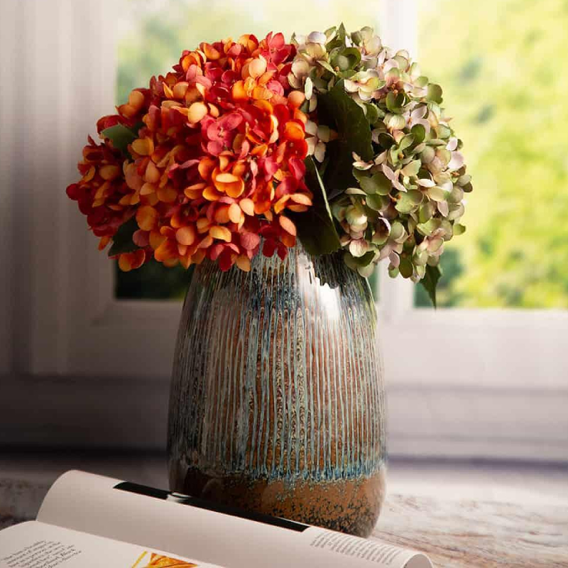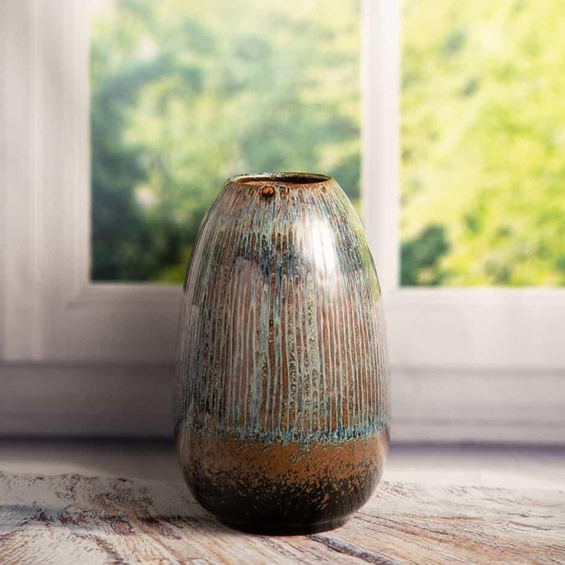Ваза с художественным дизайном и естественным видом, которая привнесет в любой интерьер ощущение спокойствия и близости к природе. Ее поверхность покрыта эффектной глазурью землистых и зеленоватых оттенков, а тонкие вертикальные рельефы придают изделию глубину и неповторимый характер. Каждая деталь выглядит немного по-разному, что делает вазу еще более аутентичной и стильной.